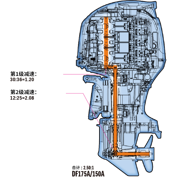 新款船外机的扭矩更大(DF150A提升3.1%,DF175A提升2.7%),采用经过证明的铃木偏置驱动轴布局和2级传动减速,可在整个转速范围内提供更加强劲的动力。即便是用于重量更重的满载船舶上,DF150A和175A也能实现更加优异的性能。