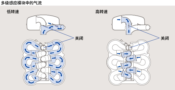 在低速和高速运行期间进行进气歧管的长、短切换,以确保合适的发动机进气量。
