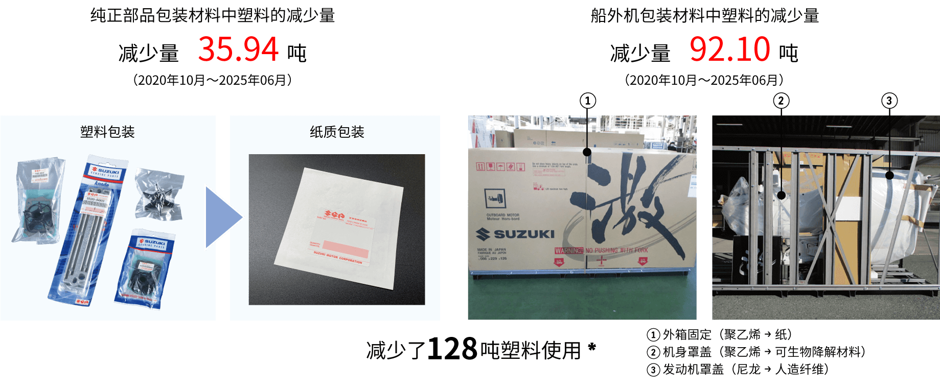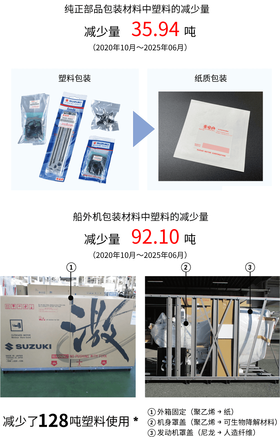 通过将铃木船外机纯正零部件和铃木船外机本体的塑料包装替换为纸/可持续生产材料,减少使用了大约128吨*的塑料。