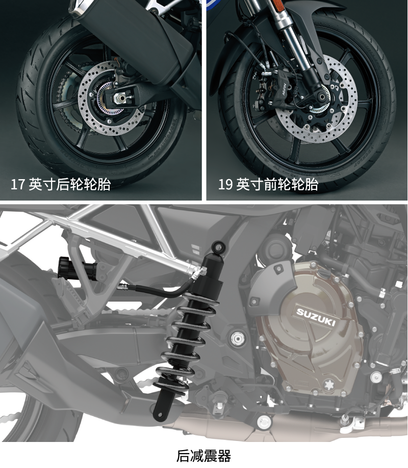 V-STROM 800 的底盘结构设计,旨在为长途旅行提供最大的稳定性、可控性和舒适性。精心致力于骑行姿势的优化。相关细节包括专属设计的车把位置,使身体稍微前倾,整体骑行姿势更舒适,更适合街道骑行,让您在高速通过急转弯时能够轻松转移重心并掌控摩托车。此外,825 mm 的鞍座高度有助于在停车时更轻松稳固地双脚着地。 可调节的 Hitachi Astemo (SHOWA) SFF-BP*(独立功能、拨叉-大活塞)悬挂提供平稳、可控的骑行体验。动力有效传递至路面,得益于专门为 V-STROM 800 量身定制的全新 7 辐铸铝车轮和邓禄普轮胎。19 英寸前轮轮胎和 17 英寸后轮轮胎有助于实现灵活的操控性、稳固的抓地力和高速稳定性。前制动器中与 310 mm 外径双盘相配合的四活塞径向安装制动钳,以及后制动器中与 260 mm 外径制动盘相配合的单活塞滑销式制动钳,提供了强大的阻滞力和可控的制动性能。