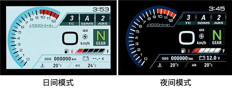 V-STROM 800 采用定制的 5 英寸彩色 TFT LCD 多功能仪表盘。清晰可辨的高品质信息显示器让您充分了解车辆的系统和设置,并提供重要的实时运行状态信息。转速表具备双重功能,当发动机达到预设转速时,可编程转速指示器就会闪烁,同时 LCD 配有一个功能,可以显示弹出警报和警告。白天(白色)和夜间(黑色)显示模式的手动或自动切换设置,令您在任何时间和任何骑行状况下都能最大程度地提高可见度。