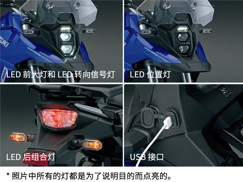垂直层叠的一对六边形 LED 前大灯,顶部配有 LED位置灯,构造紧凑,设计精巧,展现出铃木设计的现代感精髓,彰显新一代高级冒险风格。紧凑的LED 转向信号灯和 LED 尾灯也有助于确保可见度和耐久性。