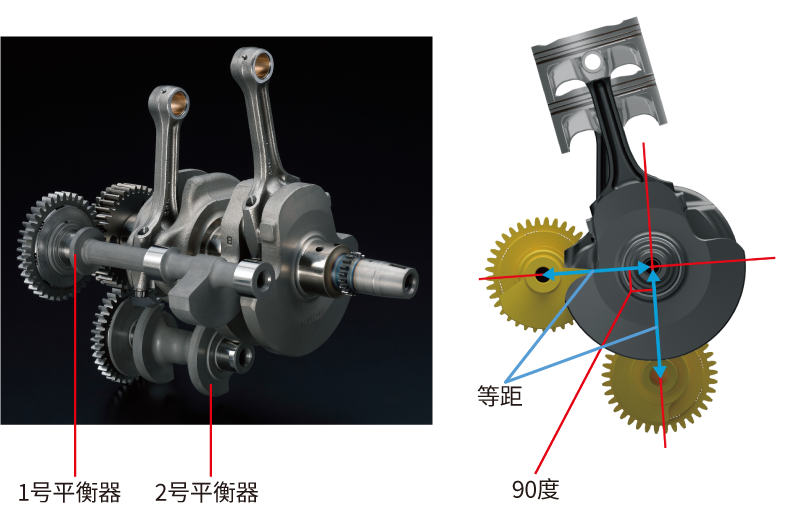 该款已获专利*的双轴主平衡器专为 776 cm³ 并列双缸发动机研发,通过将两个平衡器等距放置在与曲轴成 90° 的位置,有效抑制振动,使运行更平稳。1 号平衡器消除 1 号气缸活塞产生的主要振动,而 2 号平衡器消除 2 号气缸的主要振动。此外,将两个平衡器等距放置在与曲轴成 90° 的位置,可消除主要耦合振动,同时也有助于形成前后更加紧凑的轻型动力装置。